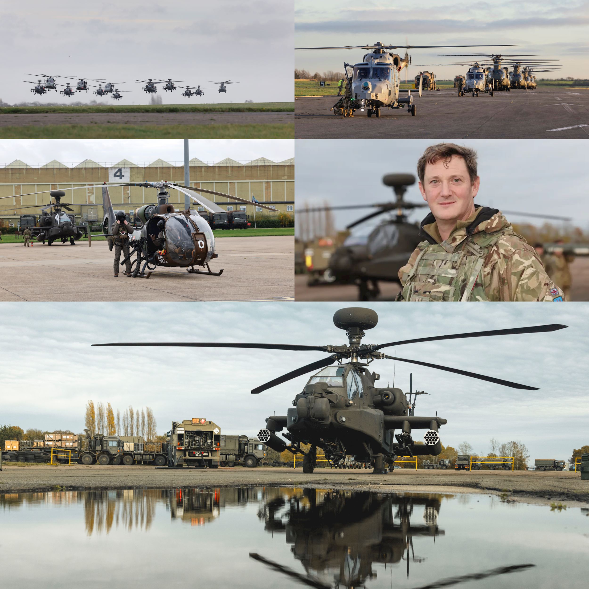 Pictured top left to bottom clockwise: A formation of 24 aircraft including Apache and Wildcat helicopters from across the AAC and RAF Chinook and French Gazelle, lifted off from Wattisham Flying Station, Suffolk, 4th November 2025; 1 Regiment Army Air Corps Wildcat Helicopters and RAF Chinooks photographed during Exercise Pinion Titan, 20th November 2025; a French Aérospatiale SA-341 Gazelle helicopter from Armée de Terre with Army Air Corps AH-64E during Exercise Pinion Titan; Commander 1st Aviation Brigade, Brigadier Nick English MBE, PhD; up to 1,000 vehicles, as well as 50 helicopters, are deployed on Ex Pinion Titan.